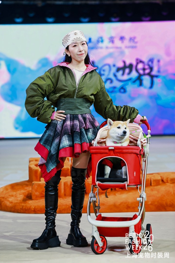 在本次发布会上,上海商学院以“创想边界”为核心命题,打破传统设计的思维定式,探索人宠关系的全新表达。在专业教师指导下,学生们聚焦“亲宠时尚设计”主题,共完成19个系列、38套人宠配套服装,以及6款宠物推车和多款采用杜邦纸等可持续材料制作的宠物出行包。设计覆盖犬、猫等常见宠物,同时延伸至北美红狐、安哥拉兔等小众宠物类型,应用场景涵盖日常家居、休闲出游、主题派对及功能性防护等多个维度,让亲宠用品成为连接人与宠物的情感纽带。