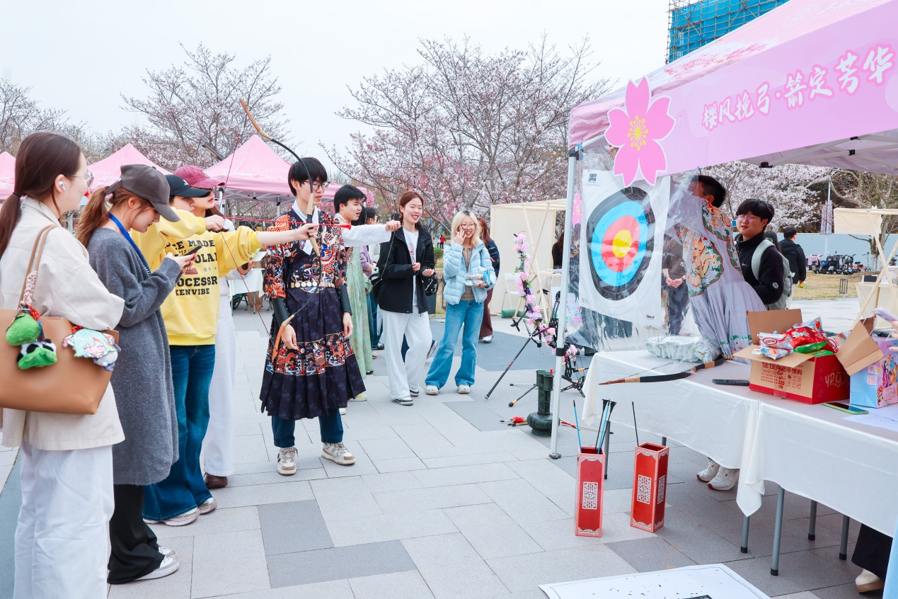 在“浪漫樱花”慢递邮局前,不少同学提笔书写,留下春日寄语给未来的自己。非遗文化体验更是人气爆棚,扎染、漆扇、纸雕、拓印等项目前排起了长队,让参与师生进一步感受到非遗魅力所在。