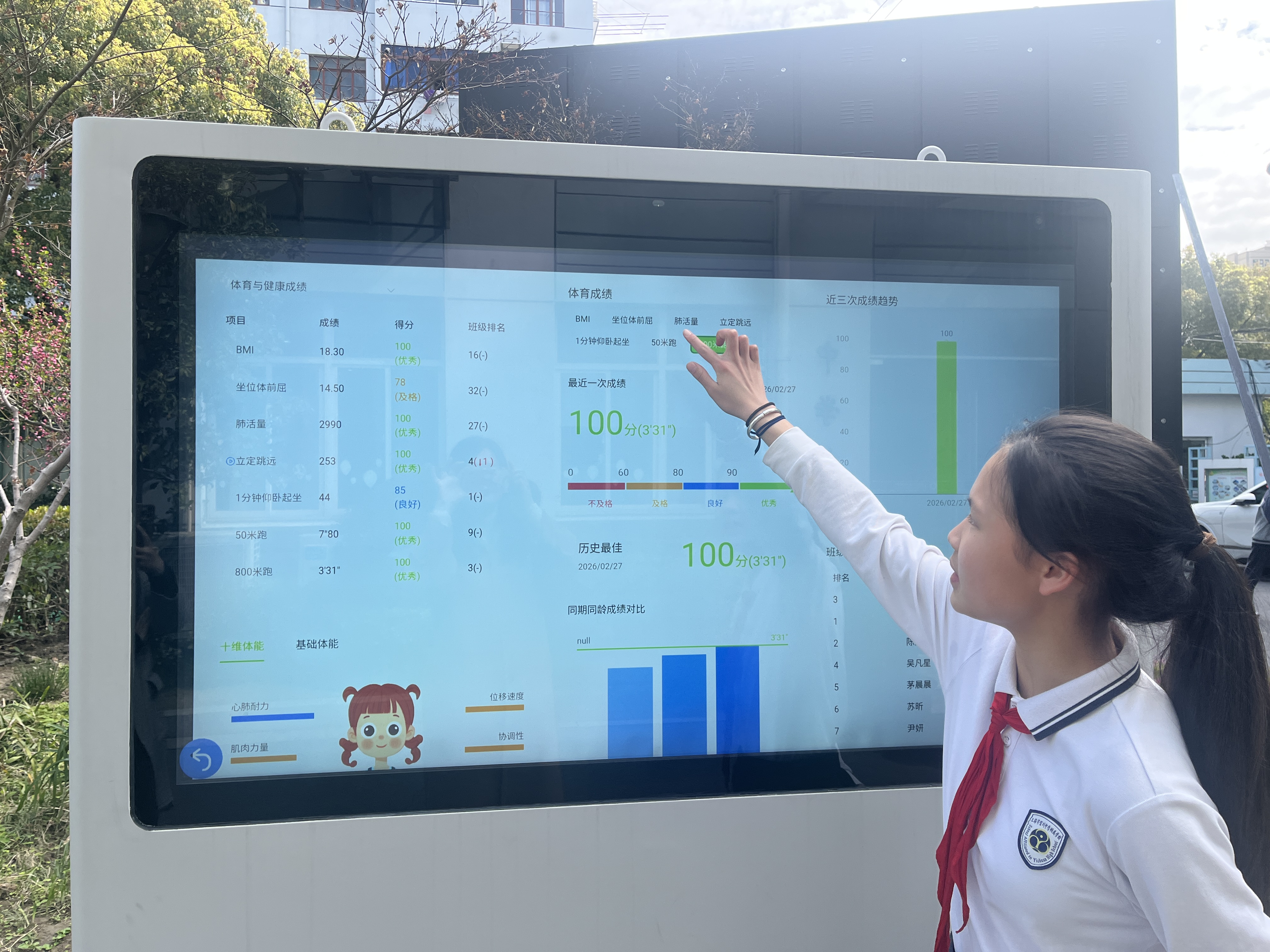 据学校副校长刘佳介绍,学生只需站在测试仪前扫脸识别,即可自主完成跳绳、立定跳远、仰卧起坐等项目的测试与记录。平台会同步留存每位学生的运动数据,并结合个体体质生成个性化运动计划,推送科学膳食建议,让“智慧”贯穿学生锻炼的全过程。