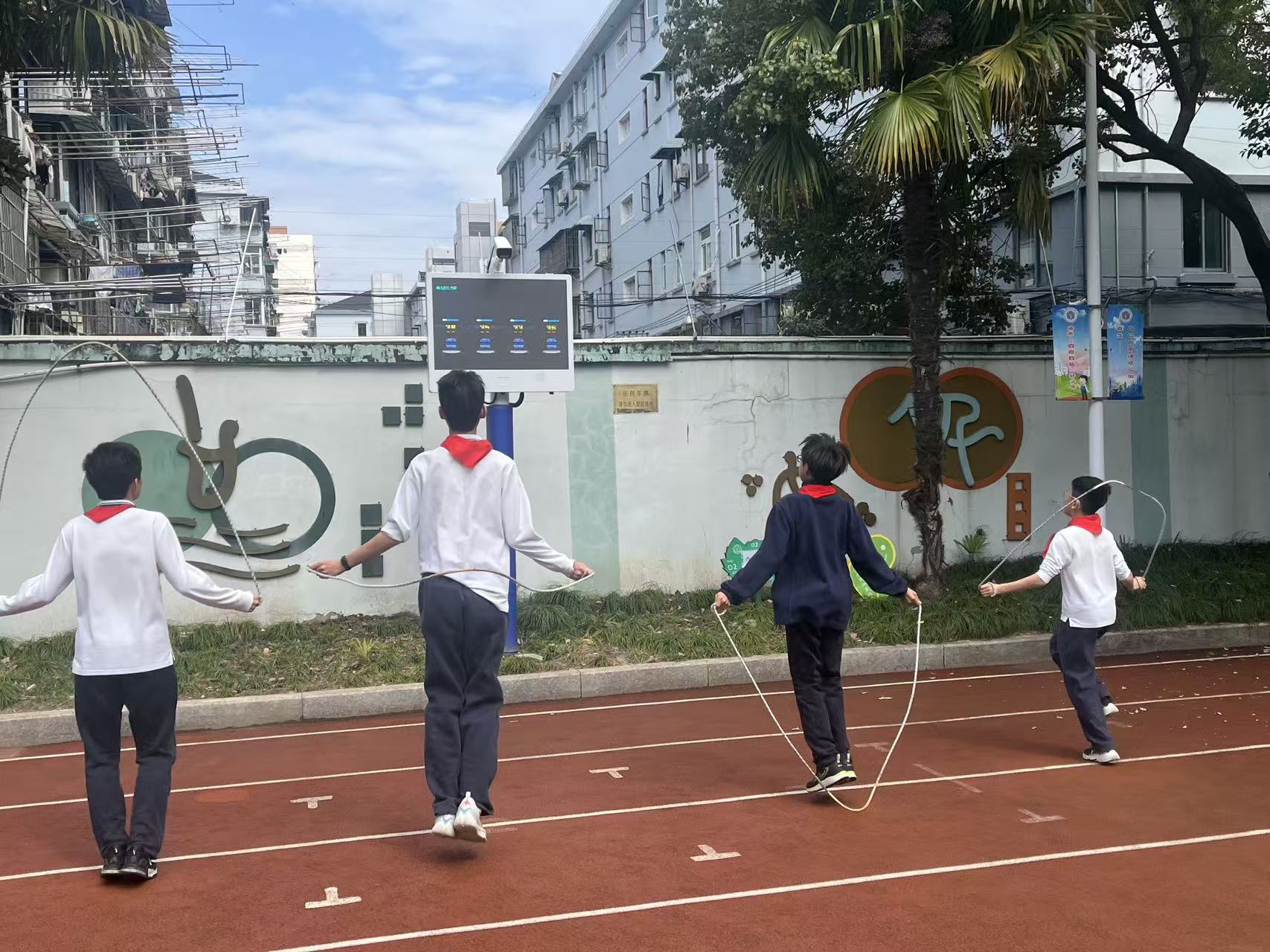 3月27日,春光明媚,上海市宜川中学附属学校的操场上,一场别开生面的跳绳比赛正在火热进行,只见满场学生按年级和性别分好组,神采飞扬地跳跃着。七年级女生魏语桐和其他同学站在新安装的智慧体育多功能测试仪前,挥动手臂,轻盈起跳,手中的绳子飞速转动。一分钟结束,她上方的屏幕上跳出“215”的成绩,她忍不住笑出了声——这个月的“月度跳绳之星”,终于被她收入囊中。
