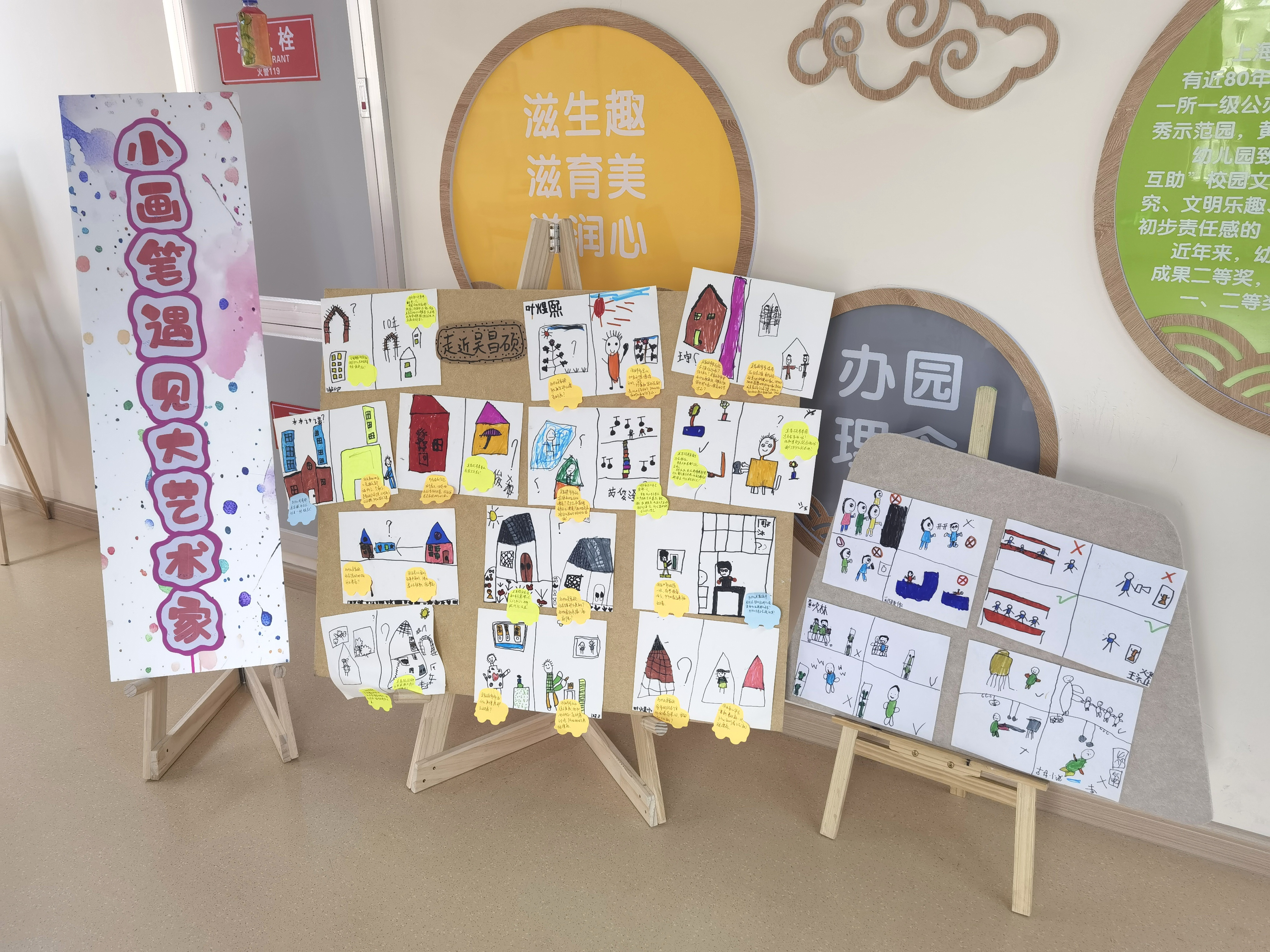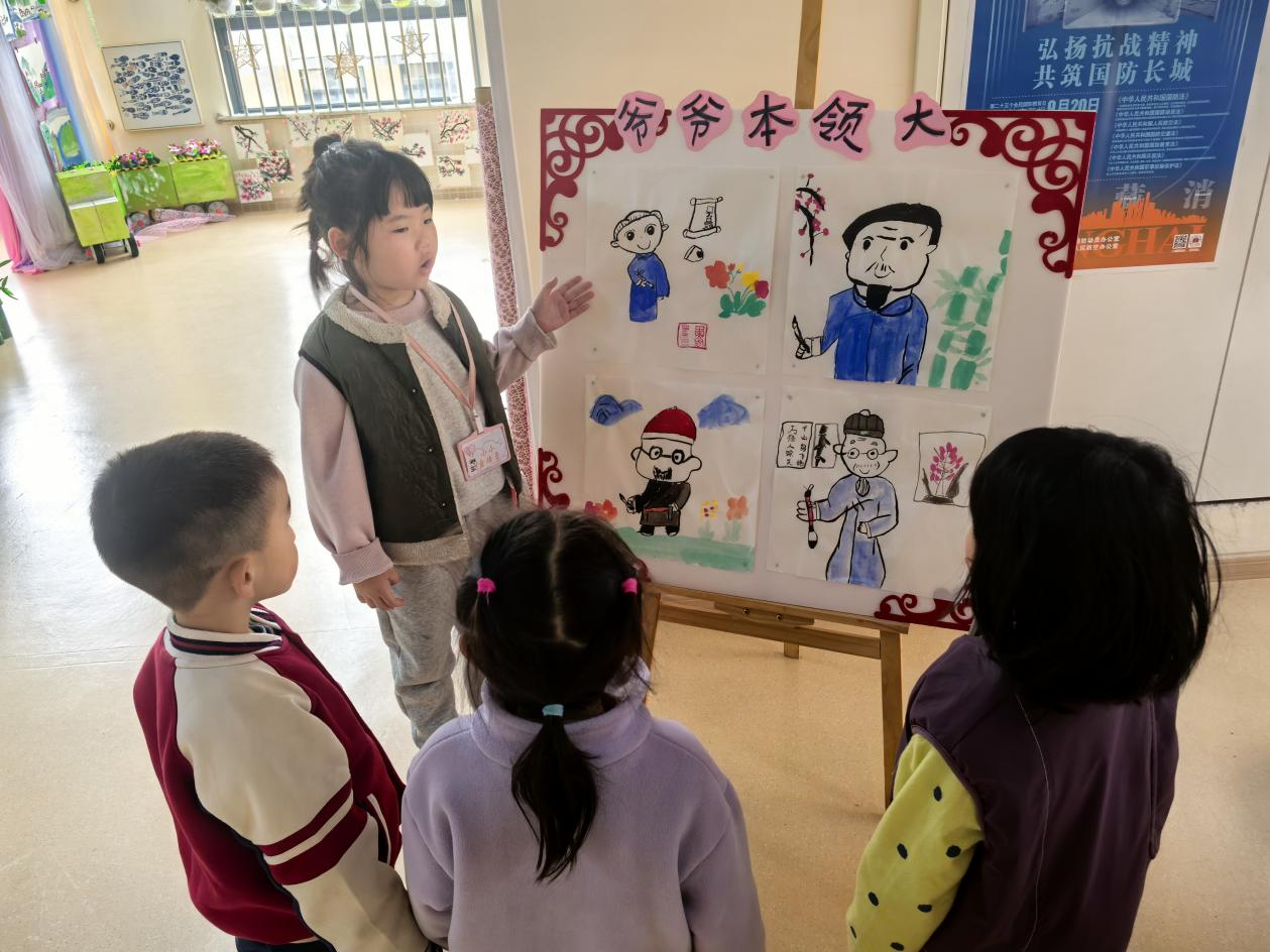 这场跨越时空的遇见,不止于“看见”,更在于 “分享”和“传递”。回到幼儿园,孩子们一起分享所见所闻,记录他们的发现:“原来爷爷能画出那么漂亮的画是因为他从小就学书法,他把书法写字的方法也用到了画画上。”“吴爷爷写的书法和我们不一样,我们写的楷书,吴爷爷会写隶书、楷书、篆书各种各样的书体,太厉害了!”“吴爷爷还会刻印章,原来印章是用特殊的刻刀刻在石头上的。”……童言童语、图画符号里满是他们的发现与思考。