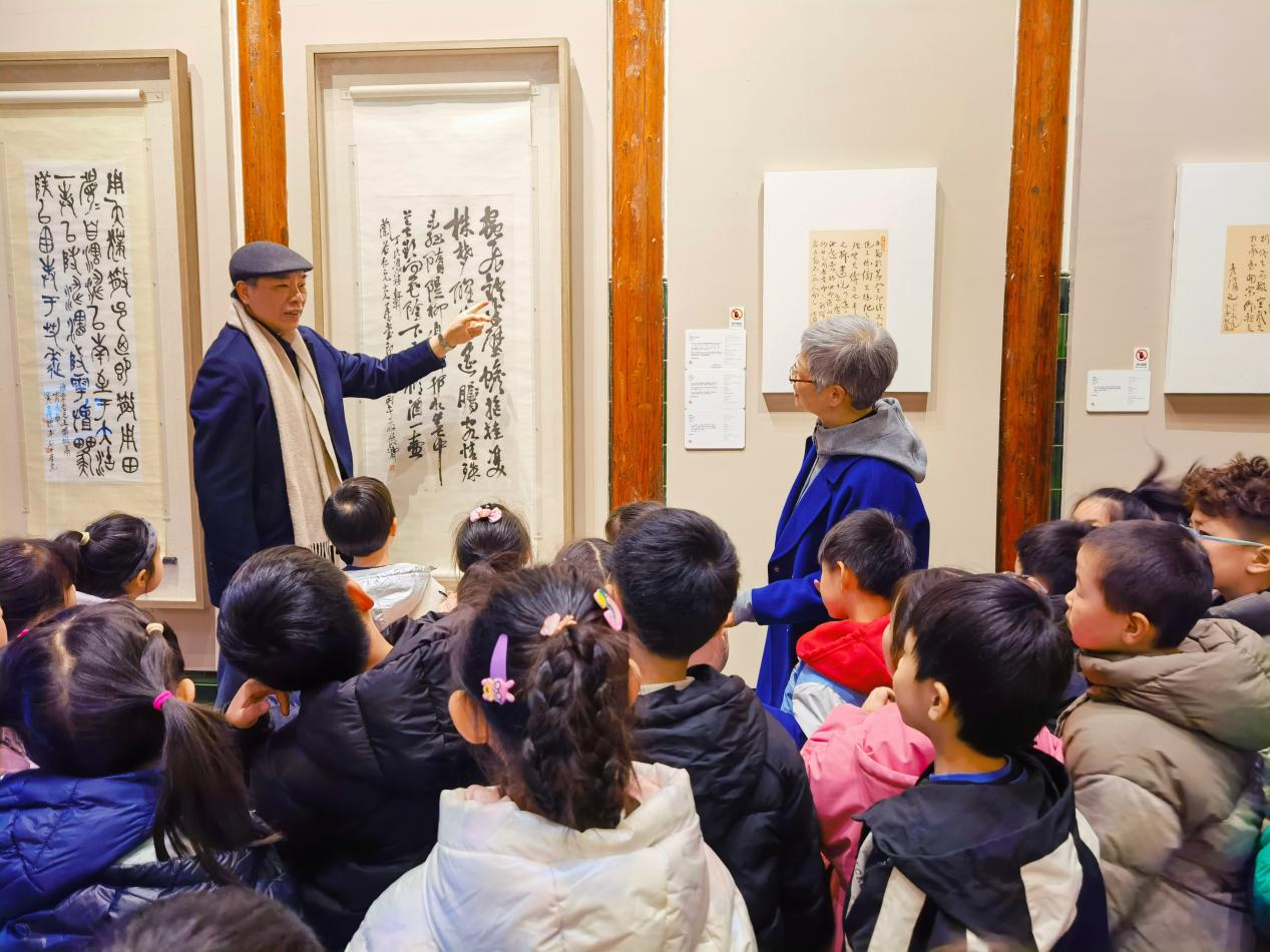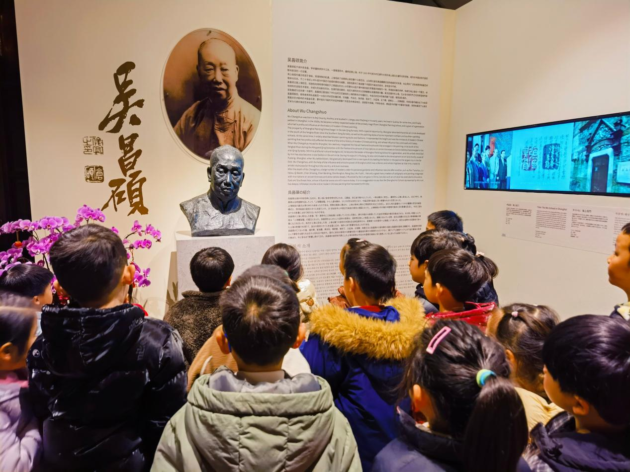 “吴昌硕自幼喜欢书画篆刻,还会作诗,一生坚持创作,最擅长画梅花、菊花,用笔墨勾勒万千美好,为中国书画艺术做出了很多贡献,是一个了不起的中国人!”吴昌硕纪念馆执行馆长吴越和胡问遂艺术馆执行馆长章尚敏的生动讲解,让百年前的吴昌硕爷爷变得鲜活又亲切。孩子们听得格外认真,小眼睛里满是敬佩。此前的一个个问题,也在讲解和互动提问中慢慢有了答案。