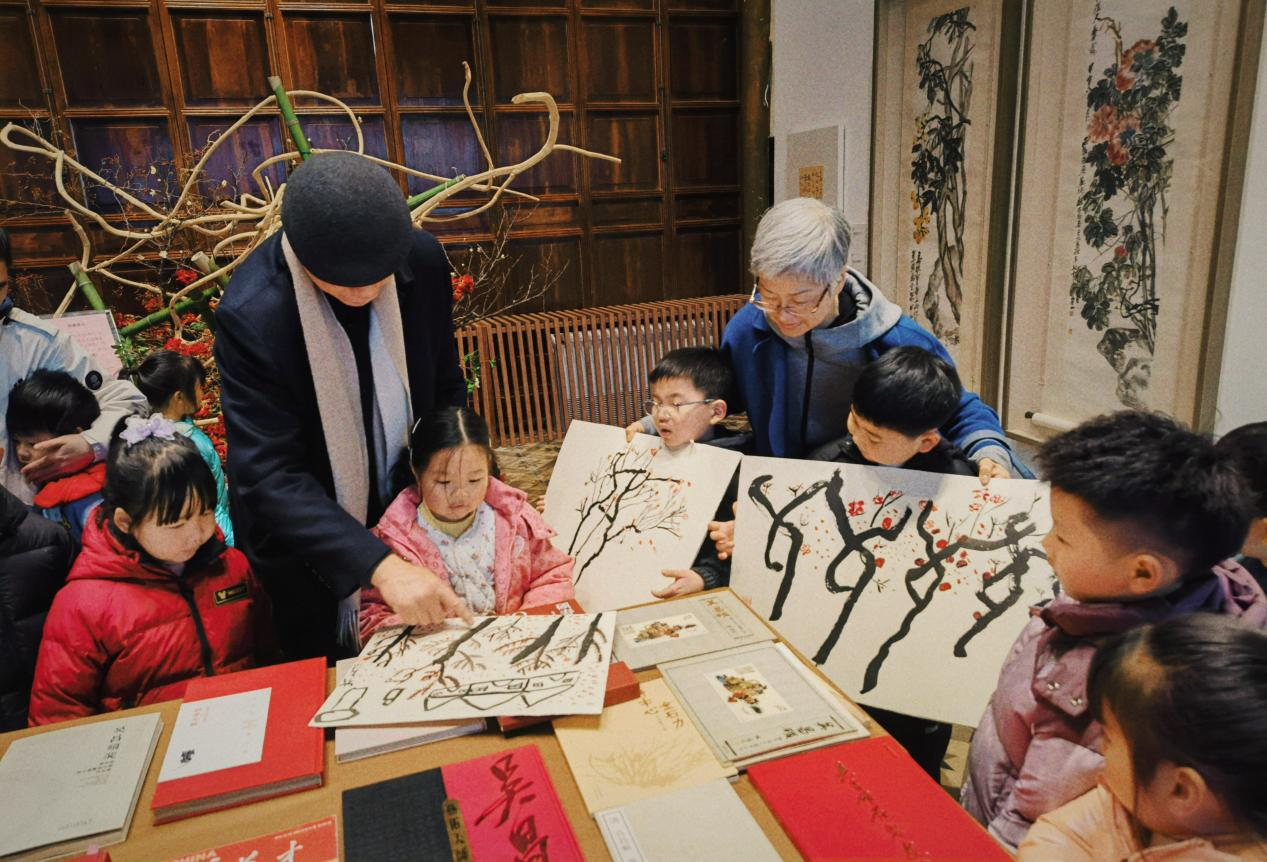 画展上,小小宣传员们自信上线,拿着自己的作品向同伴、弟弟妹妹介绍创作灵感:“我画的梅花,想像昌硕爷爷画的一样不怕冷,很坚强。”“我的玉兰花加了AI动画,像开在春天的花园里。”为了让书画艺术被更多人知晓,宝贝们还向爸爸妈妈们介绍吴昌硕爷爷的故事和作品以及自己的绘画作品和创作故事,用自己的方式传递文化。