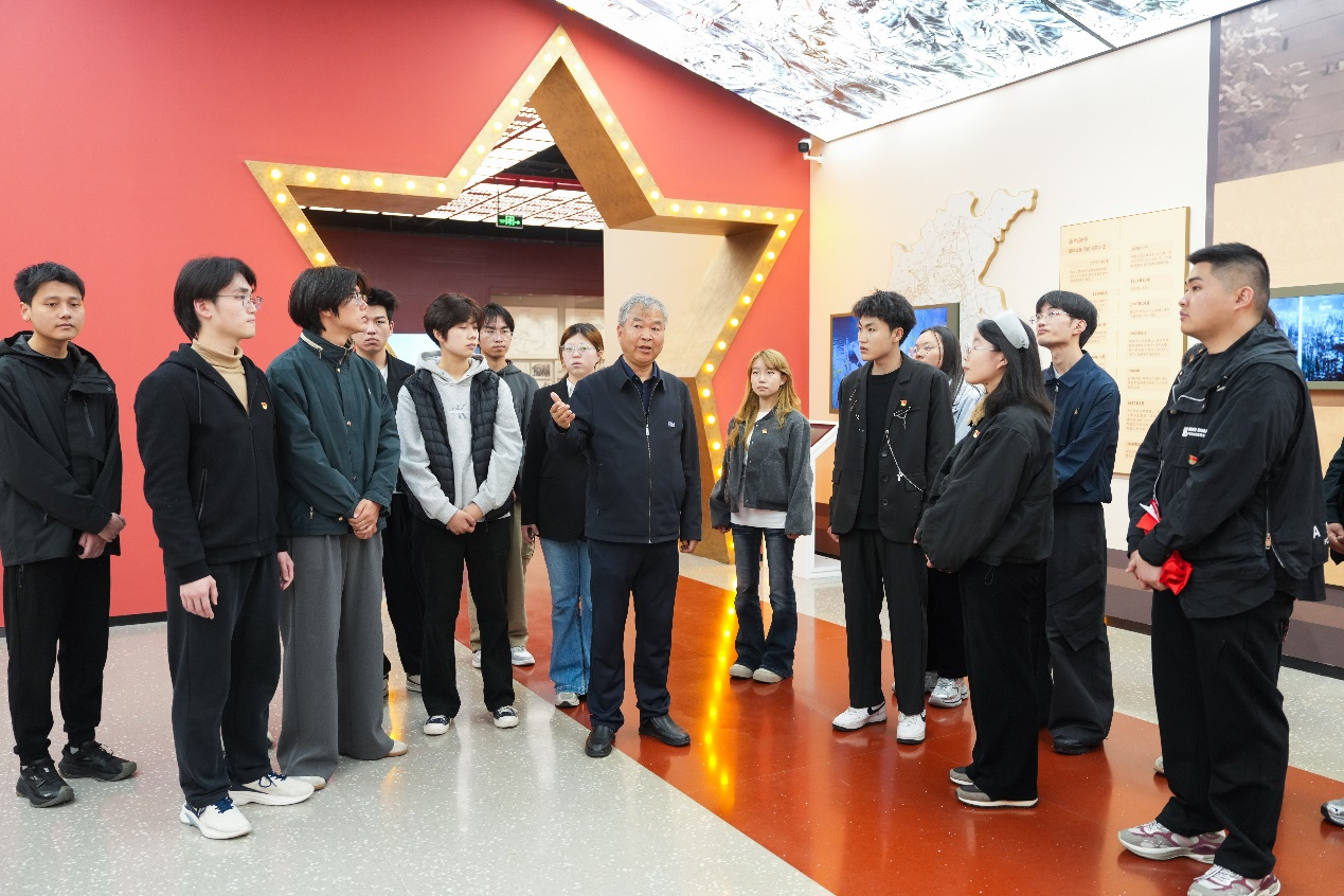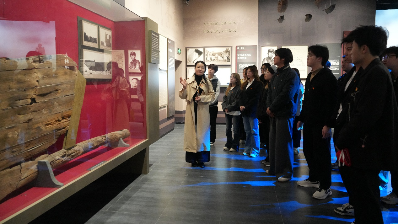 在姜文光南渡浙东乘坐的木船船舵前,马克思主义学院教师刘妤讲述了浦东抗日武装从泥城出发、开辟抗日根据地的壮阔历程。她寄语青年学子:“缅怀先烈,更要铭记历史;回望征程,更要勇担使命,把革命精神转化为奋进新时代的强大动力。”