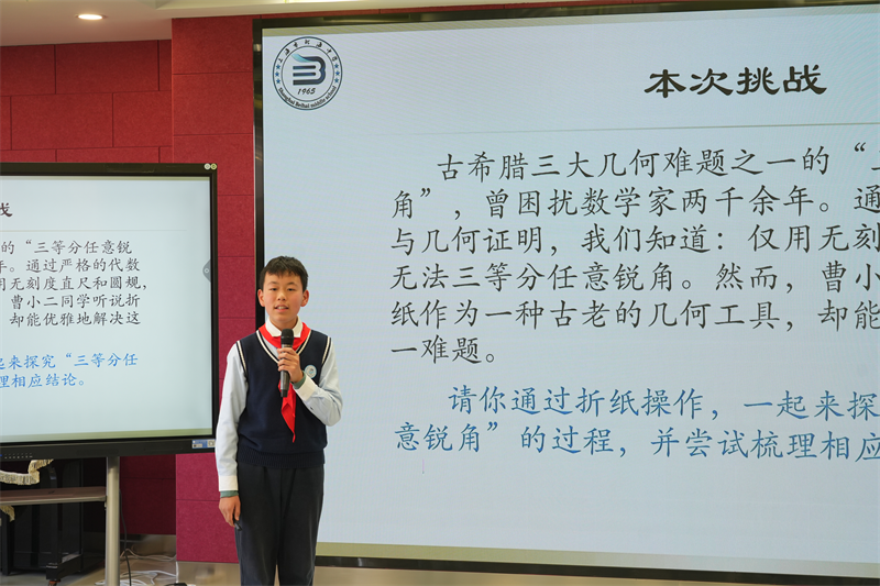 随后,来自普教院附中的八年级学生顾孝天一上台,便展现出与年龄不符的睿智与激情。他的展示题目“折纸施妙策,分角破玄机”颇有几分古风,讲解却极富现代感。“尺规作图无法三等分任意角,因为它本质上需要解三次方程,而尺规只能解二次方程。但折纸可以——折纸公理6,恰好能解三次方程。”寥寥数语,直击要害。他没有停留在理论层面,而是邀请全场听众跟随他一步步折叠正方形纸张。第一步、第二步、第三步……大屏幕上,几何画板动态演示着不同锐角下的折叠结果,三个等分角的度数始终相等,数学规律一目了然。
