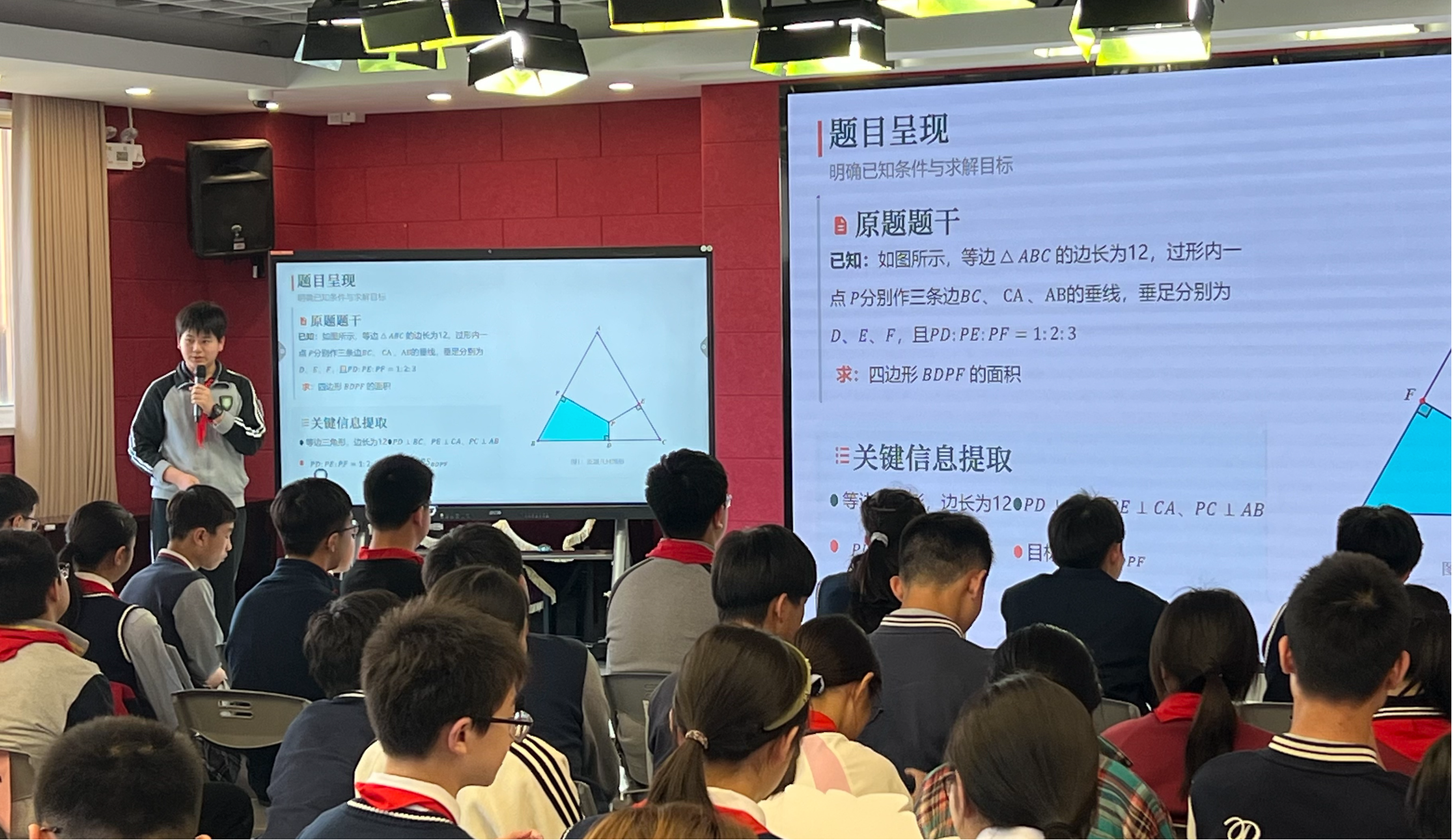 大屏幕上,几何画板同步动态演示,折痕的每一次移动、逻辑的每一次转变都清晰可见。他不仅讲操作,更讲门道,他运用了“平行加等腰出角平分线”的基本模型和全等三角形的判定,将复杂问题化归为两组等角的简洁证明,并延伸出“任意钝角能不能三等分”的问题。讲解尾声,他还引用数学奇才罗巴切夫斯基的名言:“不管数学的任意分支有多么抽象,总有一天都会回到生活来解决实际问题。”他的分享既有研究深度,又展示了数学思维,赢得了全场掌声。紧接着,兰田中学孙苡恒、北海中学俞灏东等选手依次登台,解题思路、展示特色各具风采。