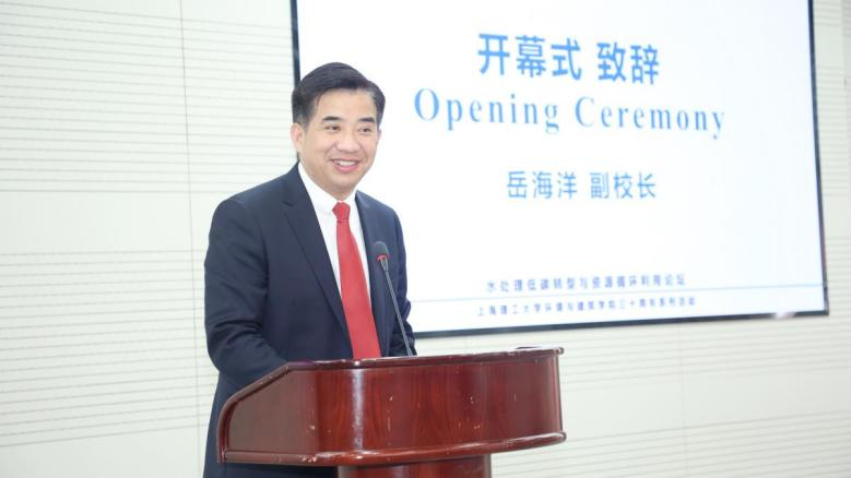 环建学院院长张宏亮主持环建学院三十周年庆系列活动启动仪式,岳海洋、Bruce Rittmann共同揭牌,与全院师生共同见证上海理工大学环境与建筑学院卅年院庆公告的发布。在简短的启动仪式后,论坛进入主旨报告环节。
