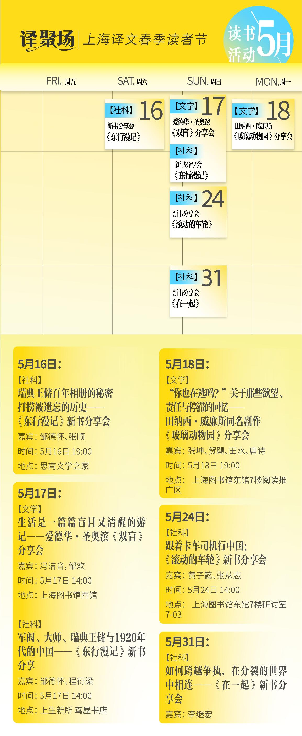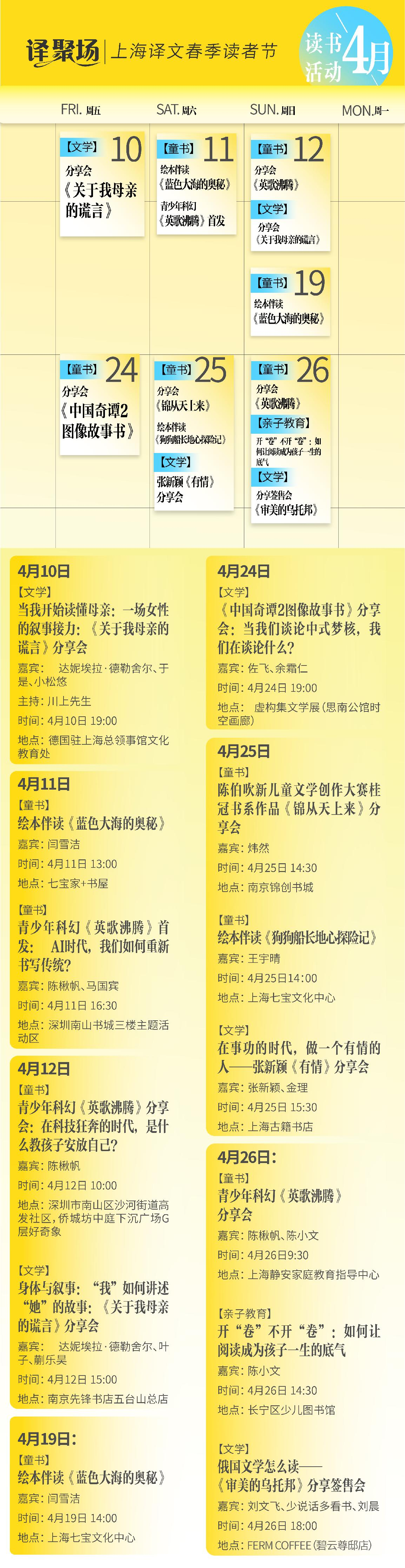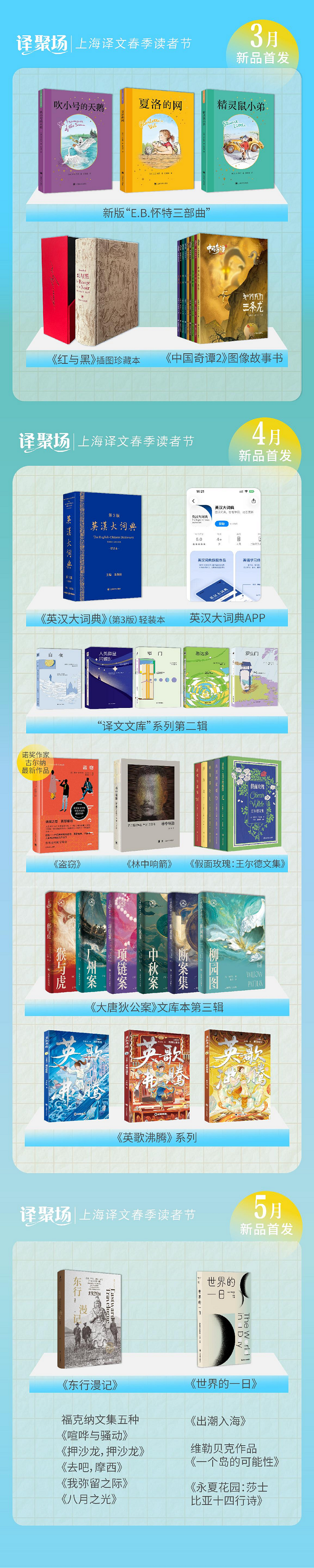 今年3—5月期间,上海译文出版社还将结合新品首发、作家来华等重要节点,依托线下书店、图书馆等阅读服务场所策划推出近30场阅读推广活动。