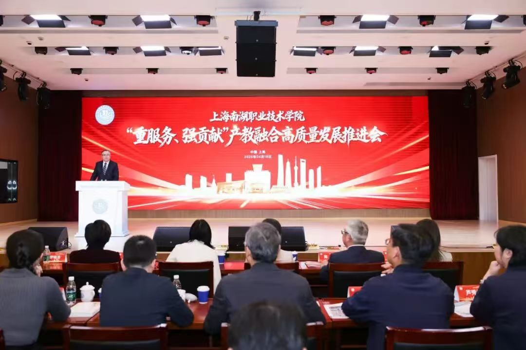 2026年4月18日,上海虹口,春风浩荡。距离上海南湖职业技术学院揭牌成立,刚好过去整整5年。这一天,学院召开“重服务、强贡献”产教融合高质量发展推进会,会场内高朋满座,会场外成果林立。教育部职业教育发展中心副主任黄辉,市教委一级巡视员陈睦,虹口区委副书记、区长蒋蕊,副区长章维、蒋婵等领导出席会议。
