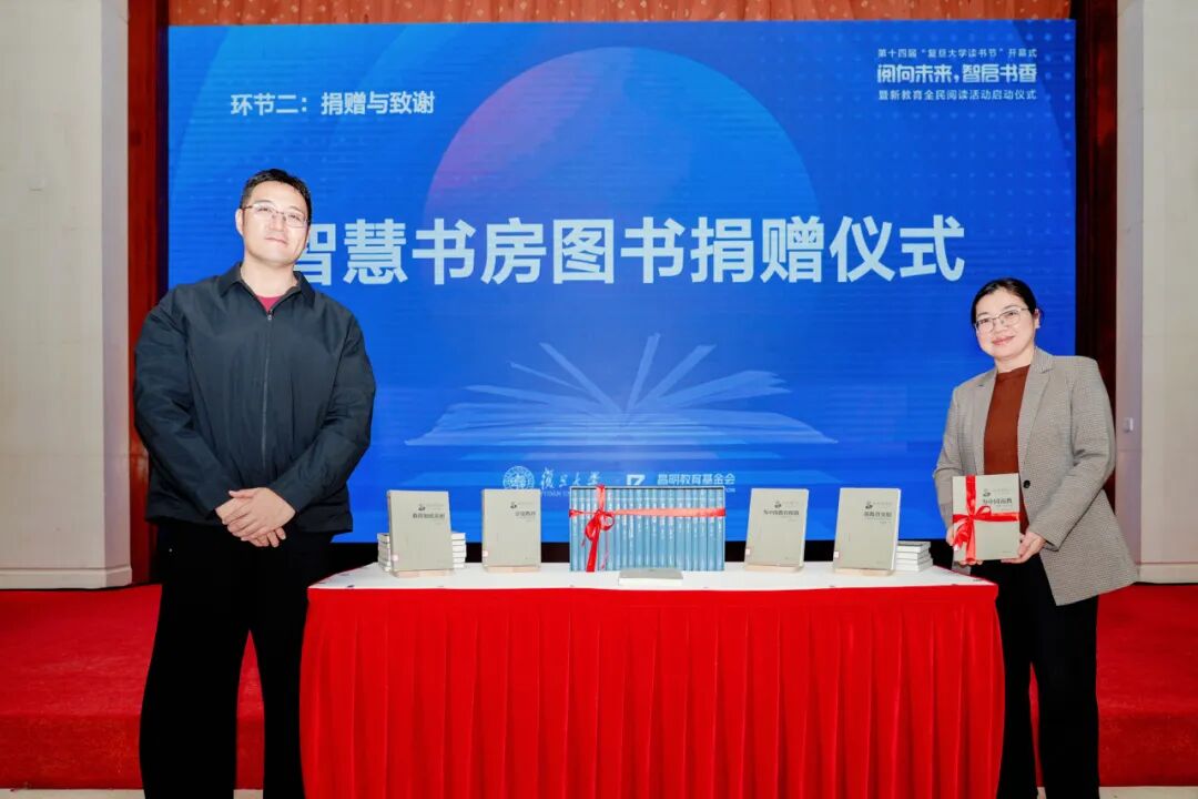 在捐赠环节,一批图书捐赠仪式举行。朱墨代表“新教育书房”向复旦大学智慧书房捐赠著名教育家、全国政协副主席、民进中央常务副主席朱永新的作品集。