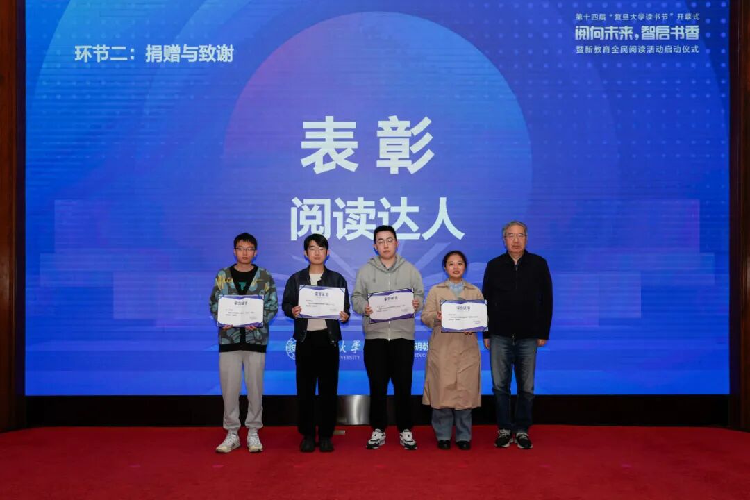 现场,嘉宾们还为2025年度图书馆“阅读达人”“优秀书评获奖者”“旦旦阅读优秀阅读者”“优秀志愿者”等获奖学生颁发了奖项。