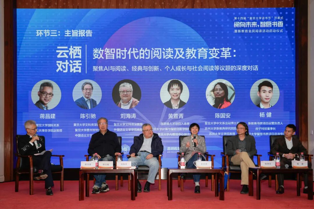 在云栖对话中,复旦大学文科资深教授、图书馆馆长陈引驰,复旦大学文科资深教授刘海涛,黄萱菁,陈国安,新教育书房项目运营负责人、谷子科技董事长、复旦大学智慧书房项目咨询专家杨健围绕数智时代的阅读及教育变革,聚焦AI与阅读、经典与创新个人成长与社会阅读等议题,开展深度交流和对谈。