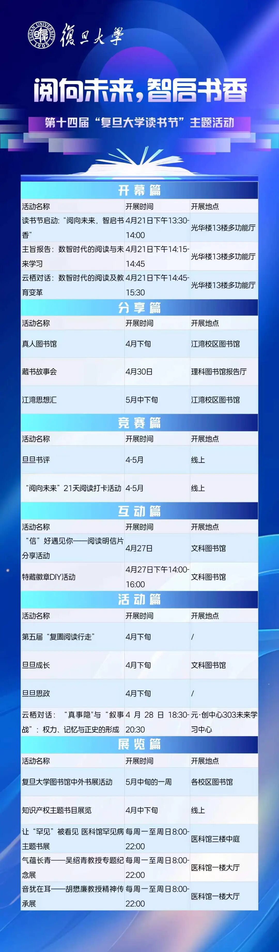4月21日至5月11日期间,复旦大学还推出了“21天阅读打卡活动”,邀请读者回归深度阅读的世界。记者了解到,复旦大学读书节已连续举办14届,本届读书节系列活动围绕“阅向未来,智启书香”,分开幕篇、竞赛篇、互动篇、活动篇和展览篇等类别,举办名家讲座、真人图书馆、藏书故事会、主题书评、专题读书会、阅读明信片分享、特藏徽章DIY、复圕阅读行走等一系列丰富精彩的活动。