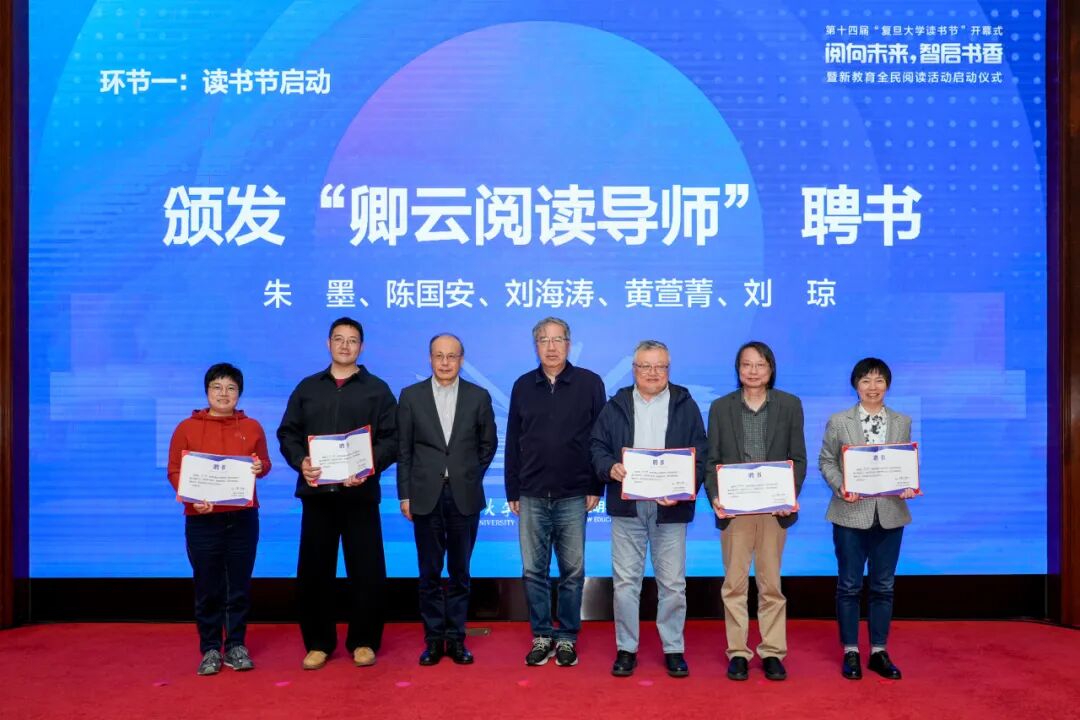 在复旦大学校园中,还活跃着一支“卿云阅读导师”队伍。活动现场,复旦大学校友朱墨、复旦大学外国语言文学学院教授刘海涛、苏州大学文学院教授陈国安、复旦大学计算与智能创新学院教授黄萱菁、复旦大学基础医学院教授刘琼受聘为新一批“卿云阅读导师”,共同繁荣复旦大学阅读生态。