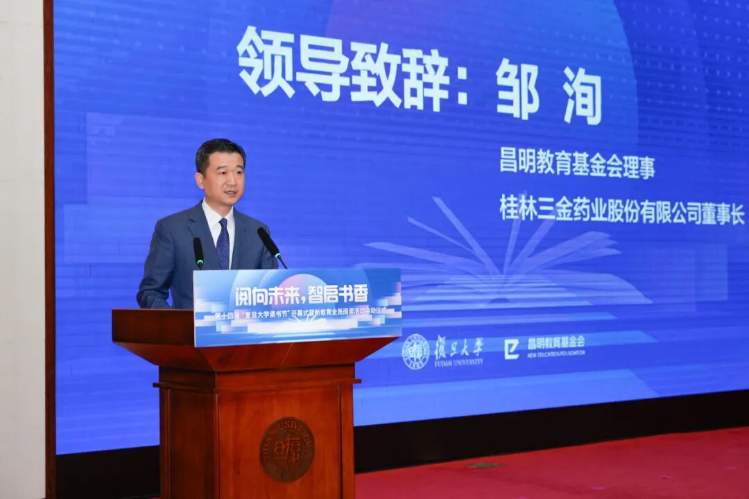江苏昌明教育基金会理事、桂林三金药业股份有限公司董事长邹洵在致辞中表示,技术革新,但阅读的意义从未褪色。在AI时代,阅读更是守护原创力、培养批判性思维的关键。激发阅读兴趣,是推动全民阅读的第一步。“期待复旦师生把阅读当作生活方式,让书香浸润每一位师生的心灵。”邹洵说。