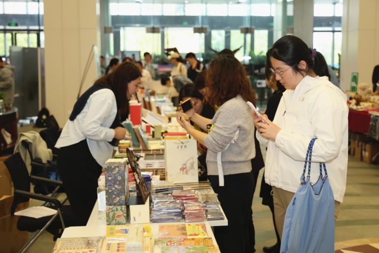 华东理工大学图书馆内,“书香漫校· 文化市集”同步热闹开市。据了解,本次市集活动联合上海世纪出版集团及华东理工大学出版社,汇聚多家知名出版机构与书店,集中展销文学、艺术、科技等领域的精品图书及特色文创产品。现场更有传统文化与手工艺体验区,师生热情参与DIY漆扇、书签、香囊、干花等活动,参与者还有机会赢取专属主题文创,收获别样阅读乐趣。传统与现代相辉映,愿氤氲书香,飘满校园。